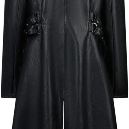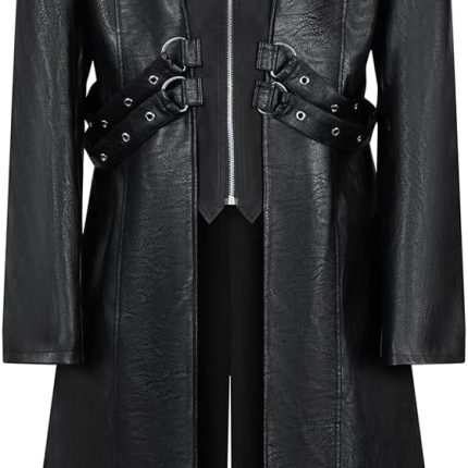 Men’s 70s PU Leather Trench Coat Long German Style Punk Motorcycle Jacket Black Leather Zipper Coat