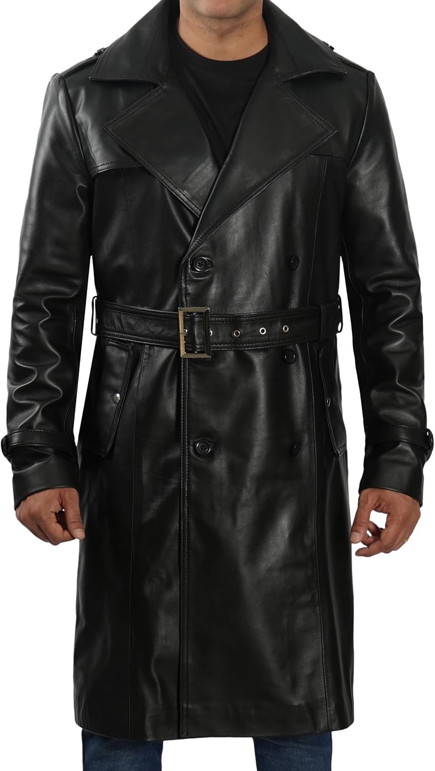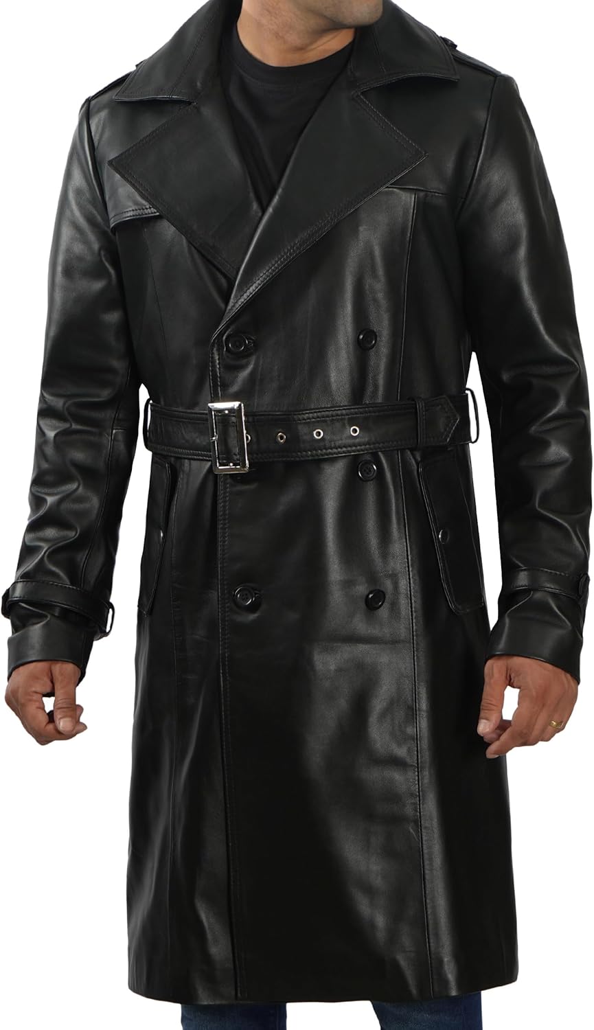 - Material & Craftsmanship: Crafted from 100% high-quality real lambskin leather, this black trench coat for men features a soft polyester lining that ensures comfort and long-lasting wear.