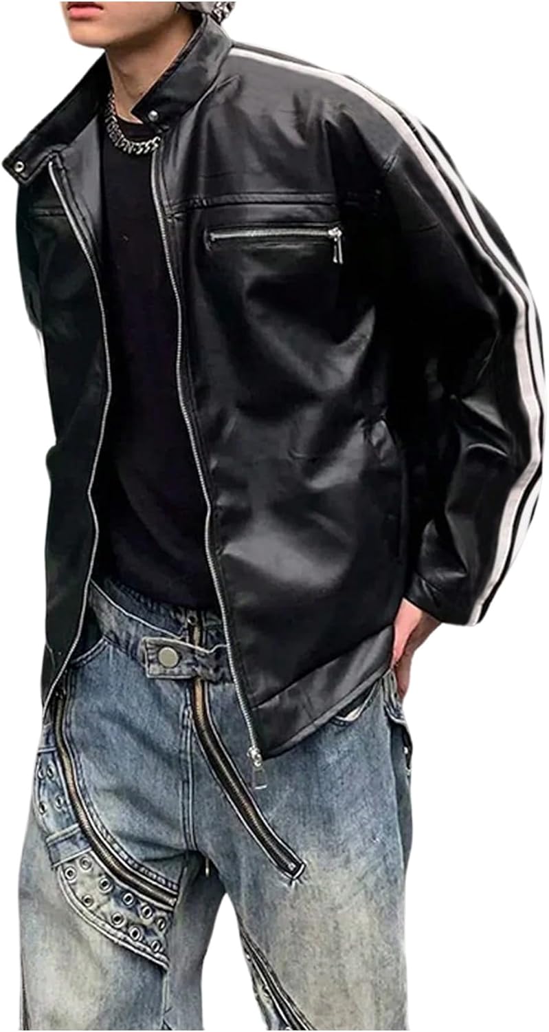 Men’s Side Stripe Faux Leather Jacket Zip Up Motorcycle Coats Outerwear Streetwear