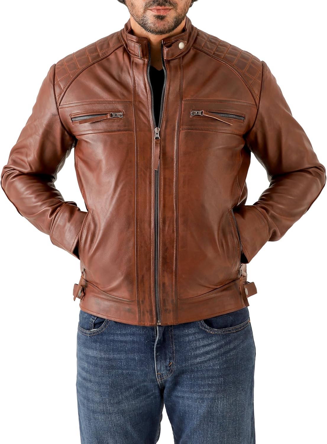 - All-Weather Comfort: Our brown leather jacket men is fully lined with soft quilted lining for all-season wear. With a full zip front, snap cuffs, and adjustable waist tabs, it’s perfect for layering during rides or evening strolls.