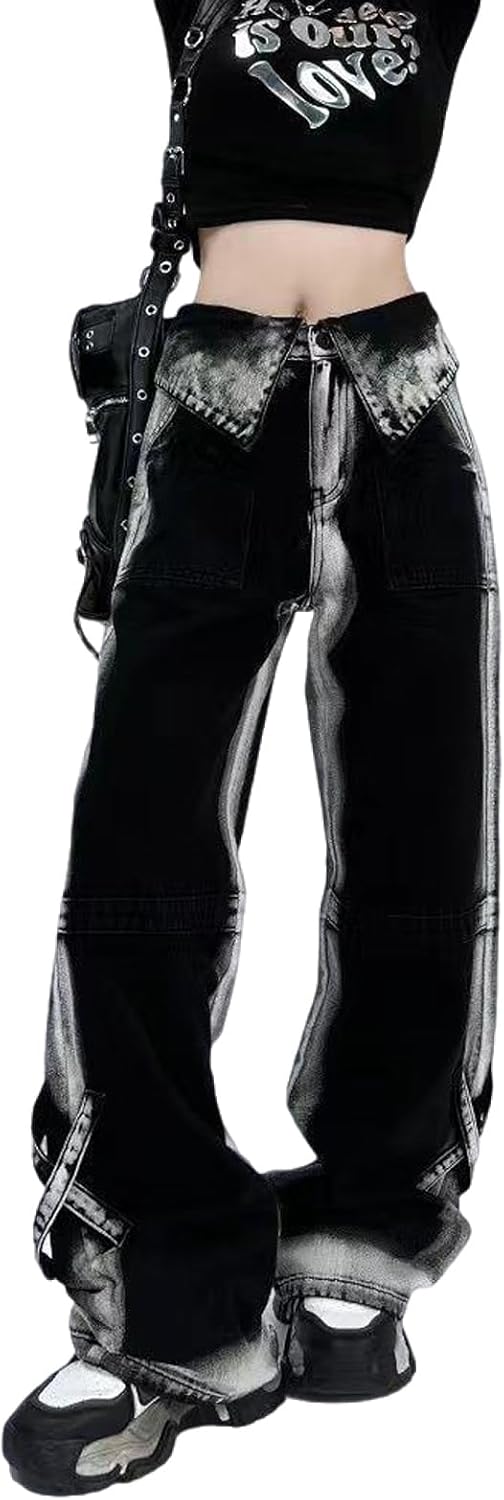 Women Workwear Jeans Vintage Contrast Jeans High Waist Loose Drop Feel Pants Gothic Wide Leg Pants